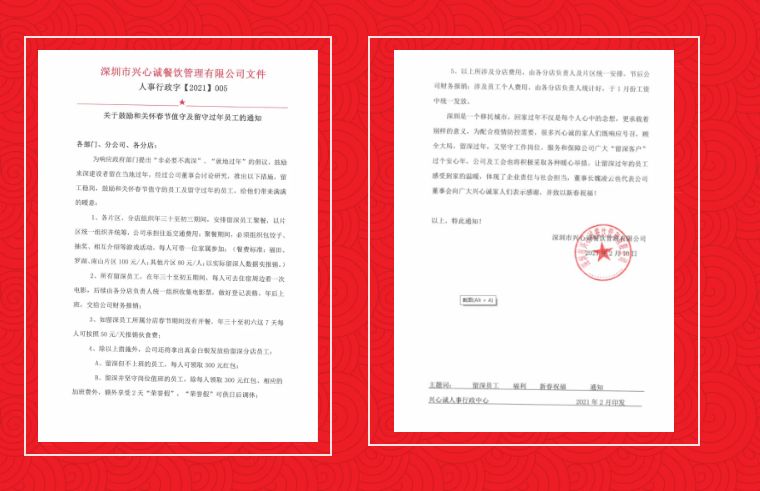 为严防疫情、鼓励员工留深过年,总部全市六大片区领导组负责人,全部下到分店,面对面的跟兴心诚家人们进行思想沟通,传达政府的号召和公司的保障措施。通过悉心沟通,总计有956名兴心诚家人们响应号召、留深过年。并愿意坚守岗位、不断拼搏,以饱满的热情用心服务公司广大“留深客户”,保障大家过个安心年。